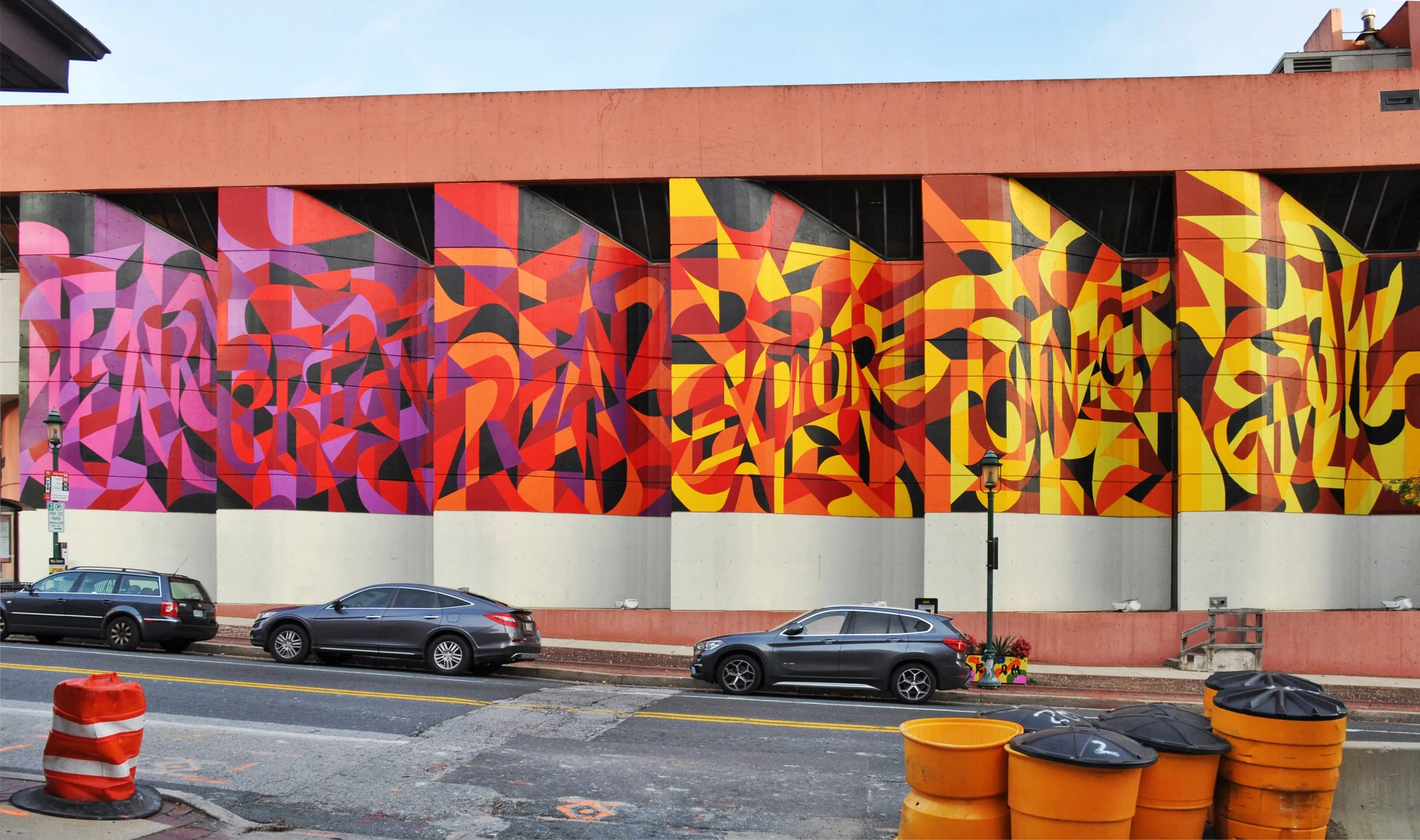 Created through the Towson, MD Chamber of Commerce, this piece spans across 6 pillars that include words associated with the function and purpose of libraries. Colors are subtly added and subtracted from each pillar to create a gradient effect across the entire piece. Project made possible by Mural Arts Co and Towson Chamber of Commerce.